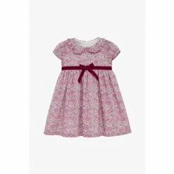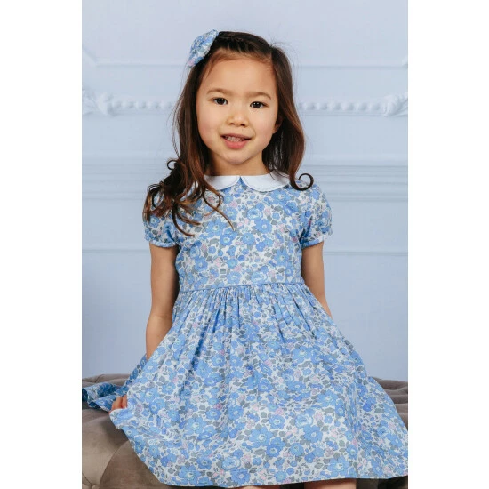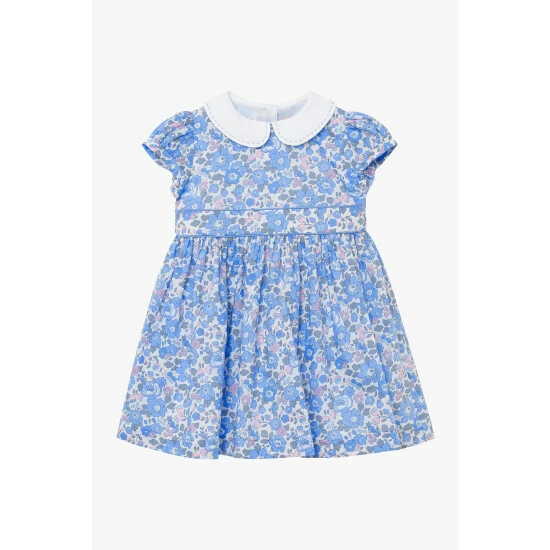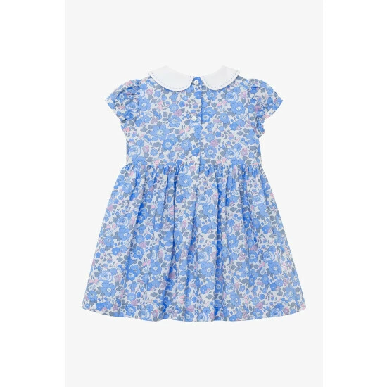 This adorable dress is made in one of Liberty’s most iconic prints, known for its stylised small floral design. Complete with pretty puff sleeves and a smart cotton poplin Peter Pan collar with blue stitch detailing it makes a beautiful dress option for baby girls. It comes fully lined with a pale blue piping detail around the waist and matching fabric self-tie bow at the back for the perfect finishing details.