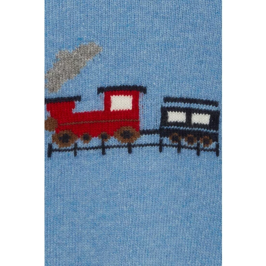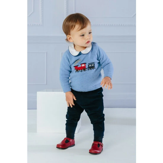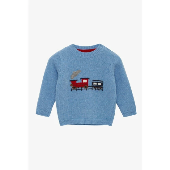 This warm wool mix jumper comes in a warm mid-blue colour that is sure to go with everything! The red and navy intarsia steam train design on the front is just the ticket to keep your little man right on track for the perfect transitional outfit.
