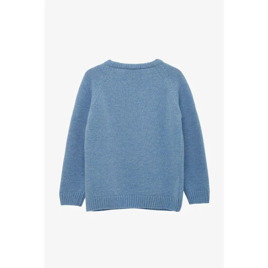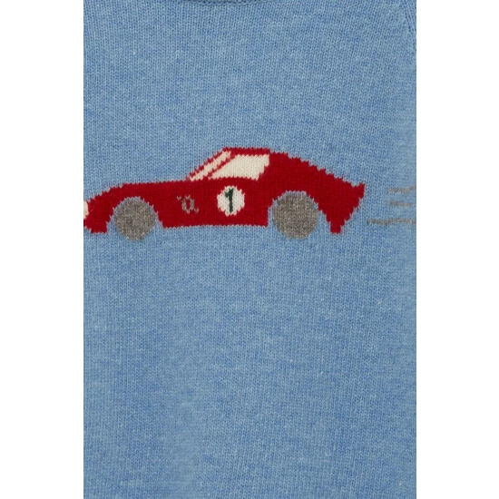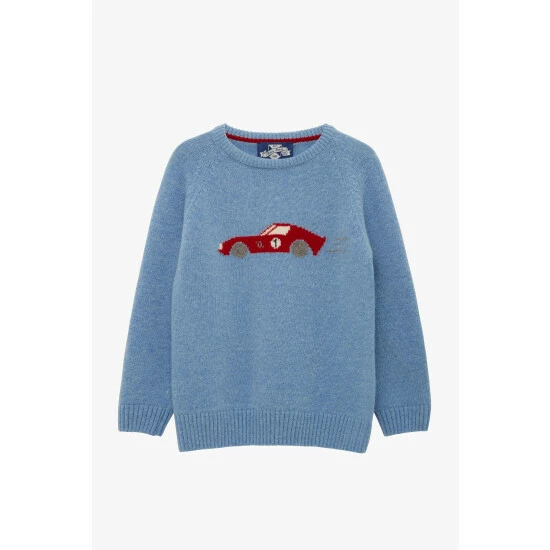 A Trotters favourite, this stylish wool mix sweater is great for layering on those cooler evenings. Available in a warm mid-blue marl, it features our signature red intarsia race car design speeding across the front.