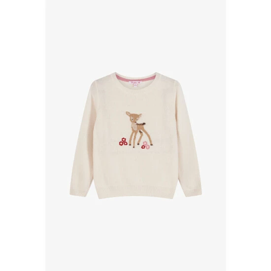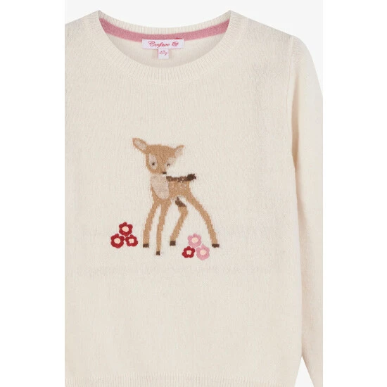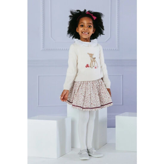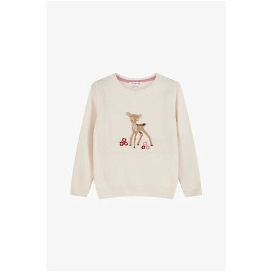 This chic winter white jumper is made in a soft and warm cashmere mix and features an adorable fawn intarsia design on the front, surrounded by pretty floral detailing. Perfect for layering when the weather gets colder, this jumper will make any outfit feel special and is ideal for the festive season.