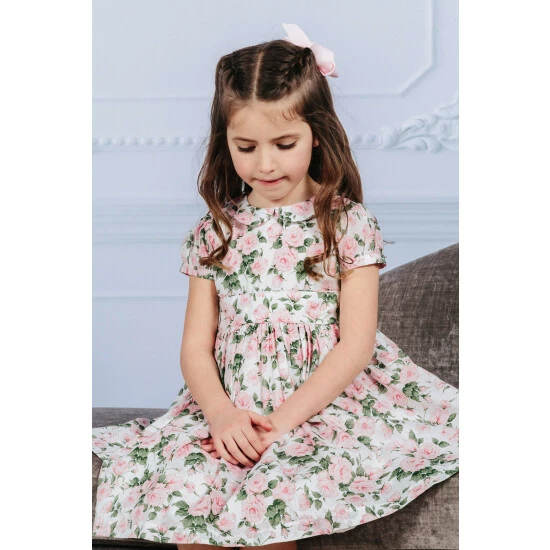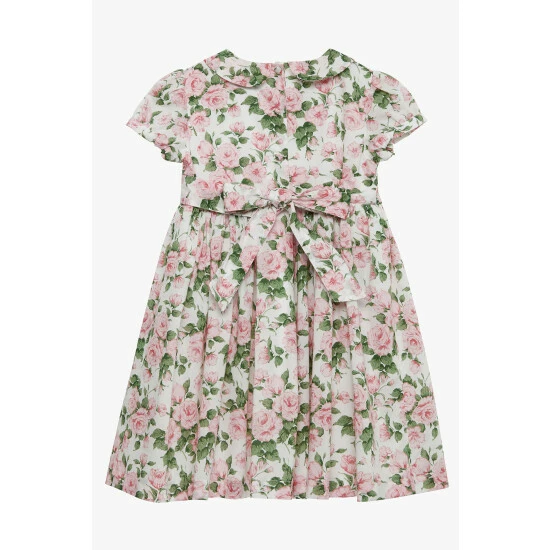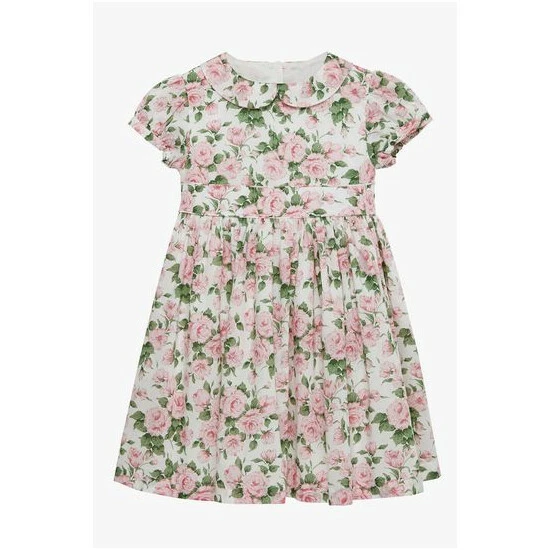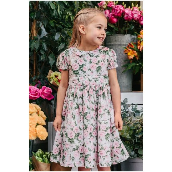 Made in Liberty’s Carline print fabric, this beautiful rose floral design dates from the 90s and draws inspiration from the bold blooms synonymous with classic 50’s prints. This smart party dress comes with elasticated puff sleeves, a self-fabric Peter Pan collar with matching waist tie for the perfect finish. Fully lined and perfect for twirling, it’s the ultimate summer party dress!