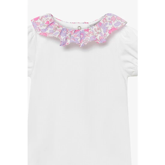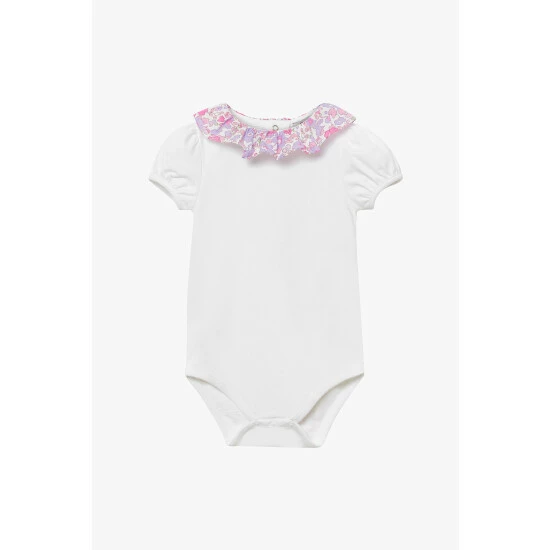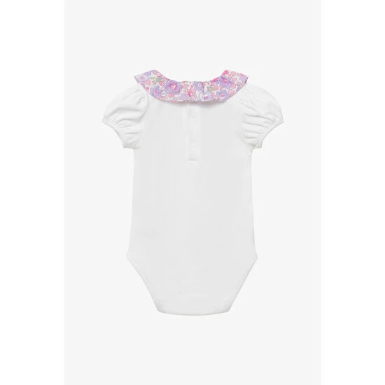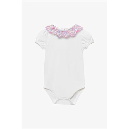 This classic white body has been elevated by the addition of a smart willow collar made in Liberty’s iconic Betsy print fabric, a classic 1930’s floral print featuring an all-over pattern of mixed flowers. The soft hues of pink and blue add a delicate injection of colour into this wardrobe staple that will complement almost every outfit. Popper fastenings at the back and leg allow for easy changing and dressing.