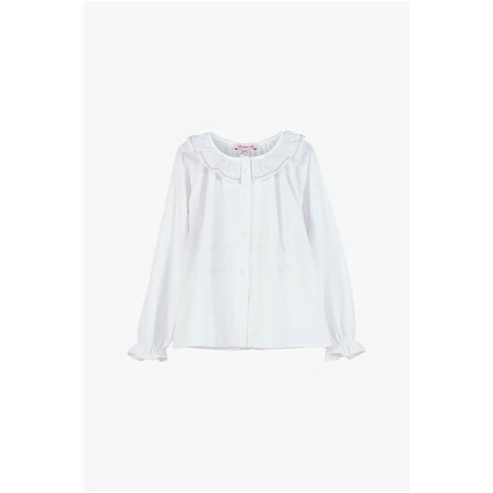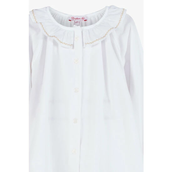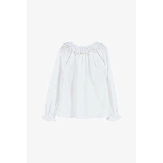 Our classic jersey blouse has been given a festive twist this season with the addition of delicate gold embroidery along the length of the frilled, willow collar. This simple and elegant jersey top for girls features a full length button fastening down the front, tapered sleeves and elasticated cuffs. It's perfect for layering under your favourite knitwear for a smart finish.