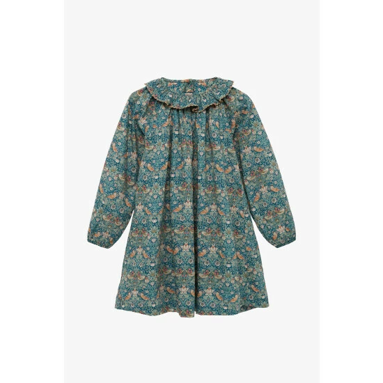 Made in Liberty’s Strawberry Thief print fabric, originally designed by William Morris in 1883, this A-line dress has a relaxed, floaty shape and combines a wonderful balance of blue, green and rust tones, highlighted by a statement willow collar. The long raglan sleeves are finished with an elasticated cuff to help keep them in place when layering under a coordinating cardigan.