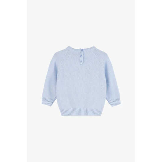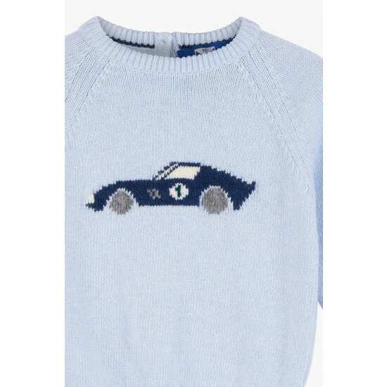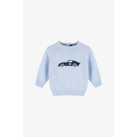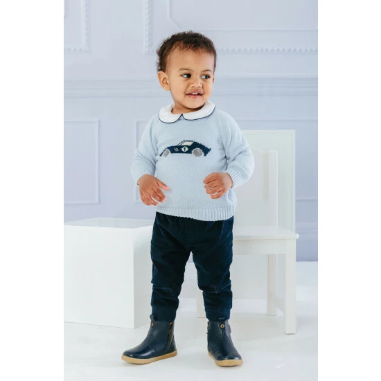 Now available for baby boys, this Trotters favourite is made in a soft and warm cashmere mix and is great for layering on those cooler evenings. Available in a classic pale blue, it features our signature intarsia race car design speeding across the front.