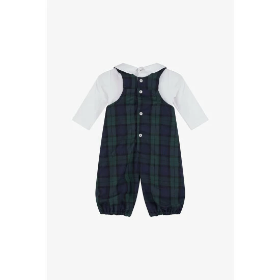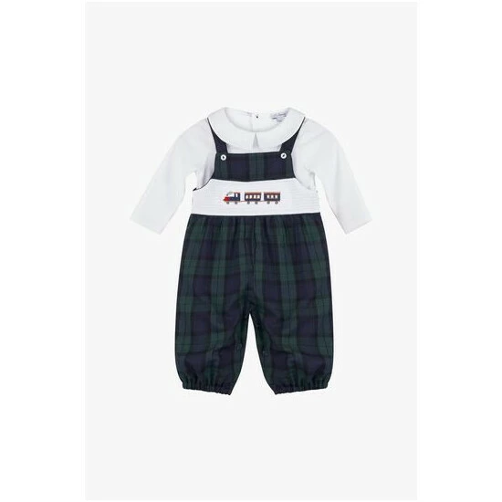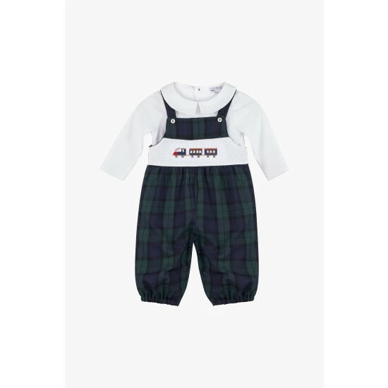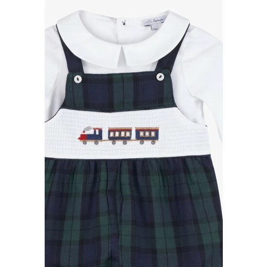 These sweet dungarees make both a practical and stylish outfit for baby's first Christmas. Made in a festive navy tartan, they feature a delicate smocked panel on the front with sweet choo choo train embroidery detail. Complete with an integrated soft jersey body and handy popper fastenings along the leg for easy dressing and changing, this makes a great everyday option for baby boys.