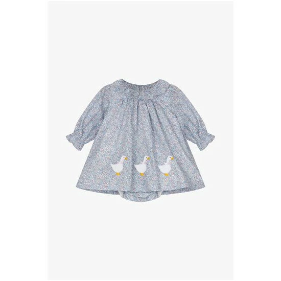 Made in Liberty’s Eloise print fabric, an archive design depicting small Victorian florals, our classic My First Duck Dress makes a beautiful gift and a wonderful keepsake for any new arrivals. It features long sleeves with elasticated cuffs, a delicate willow ruffle collar and our signature appliqué ducks along the hem, complete with satin bow detailing. Fully cotton lined, it’s sold with a pair of matching knickers for the ultimate baby girl outfit.