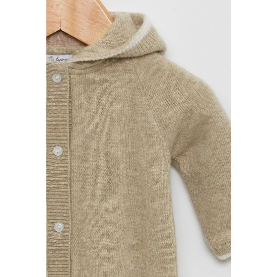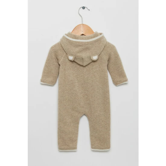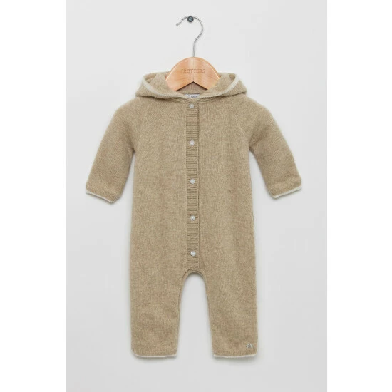 Made in a luxuriously warm and soft cashmere mix, this all-in-one comes in a chic and unisex oatmeal colour and features a pearlised button-down front and cosy hood, complete with teddy bear ear detailing for a sweet touch. Layer over a classic body when the weather gets colder for a stylish, practical outfit. Leg popper fastenings allow for easy changing and dressing.