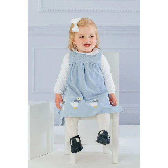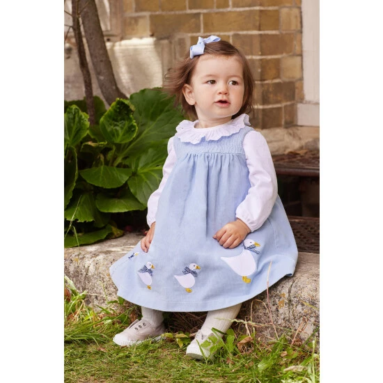 This classic little Jemima smocked pinafore comes in a fine needlecord and features our appliqué Jemima ducks waddling along the bottom hem complete with complementary satin bows. Fully lined and sitting just below the knee, layer over one of our classic bodies and for a sweet, traditional look for baby girls.