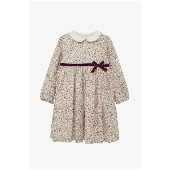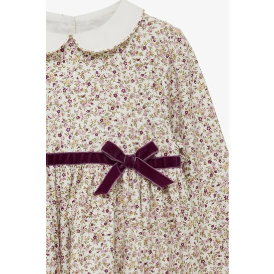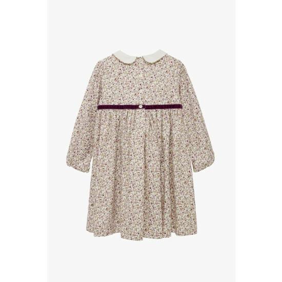 Our Aubrey dress is made from 100% organic cotton and showcases a beautiful ditsy floral print of pink and lilac tones. Complete with long sleeves, and off-white twill Peter Pan collar with matching fabric piping, and a tonal purple velvet bow, this would make a chic addition to any young girl’s wardrobe.
