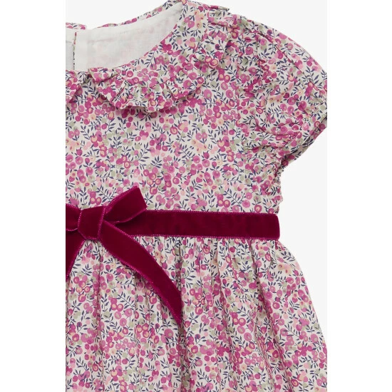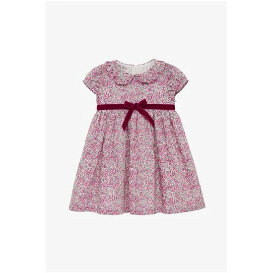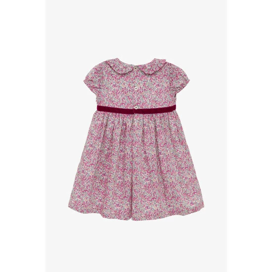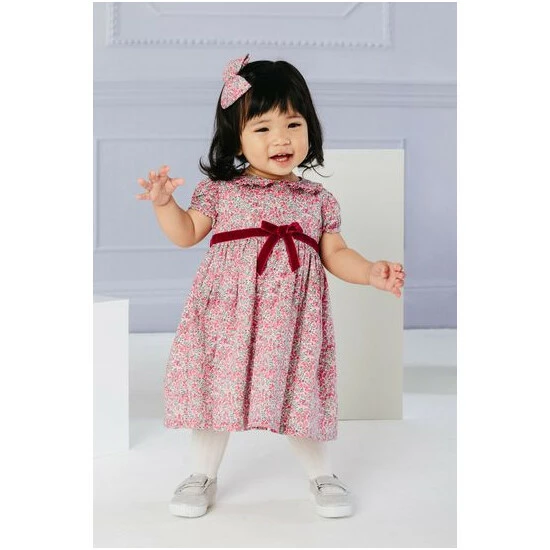 Made in Liberty’s Wiltshire Bud fabric, a small all-over leaf and berry pattern, this beautiful dress features short puff sleeves, a matching pie crust frill collar and pearlised button fastenings down the back. Fully lined, it’s finished with a complementary bright pink velvet bow sash around the waist and will make the perfect addition to your wardrobe this festive season.