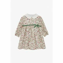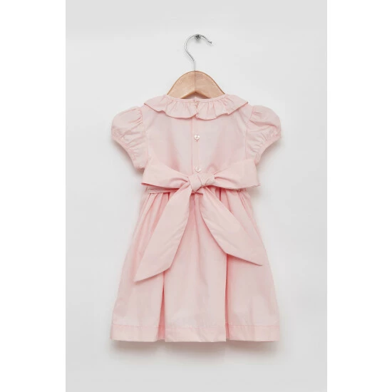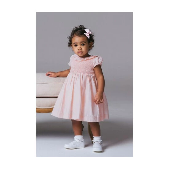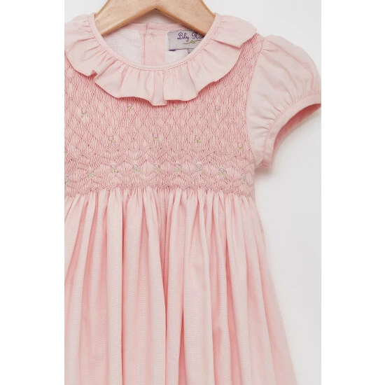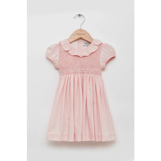 Every little flower girl s dream, our gorgeous rose dress has an intricate, hand-smocked upper with miniature rosebud detail; the perfect outfit for all those summer parties and weddings. Delicate willow collar, integrated petticoat, pearlised button-up back and matching ribbon tie are beautiful finishing touches to this stand out piece. Please note: as these dresses are hand smocked, the chest can be quite fitted and we recommend purchasing up one size.