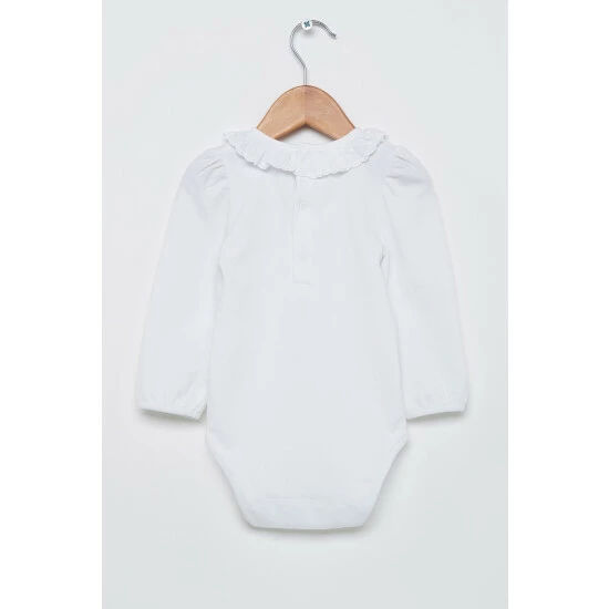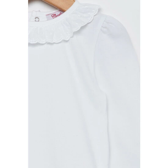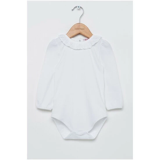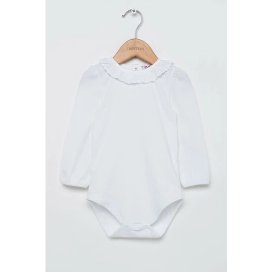 A supersoft stretchy jersey all-in-one for little girls, this Laura Anglaise body features a pretty broderie anglaise collar and has popper fastenings at the back and the leg for easy changing.